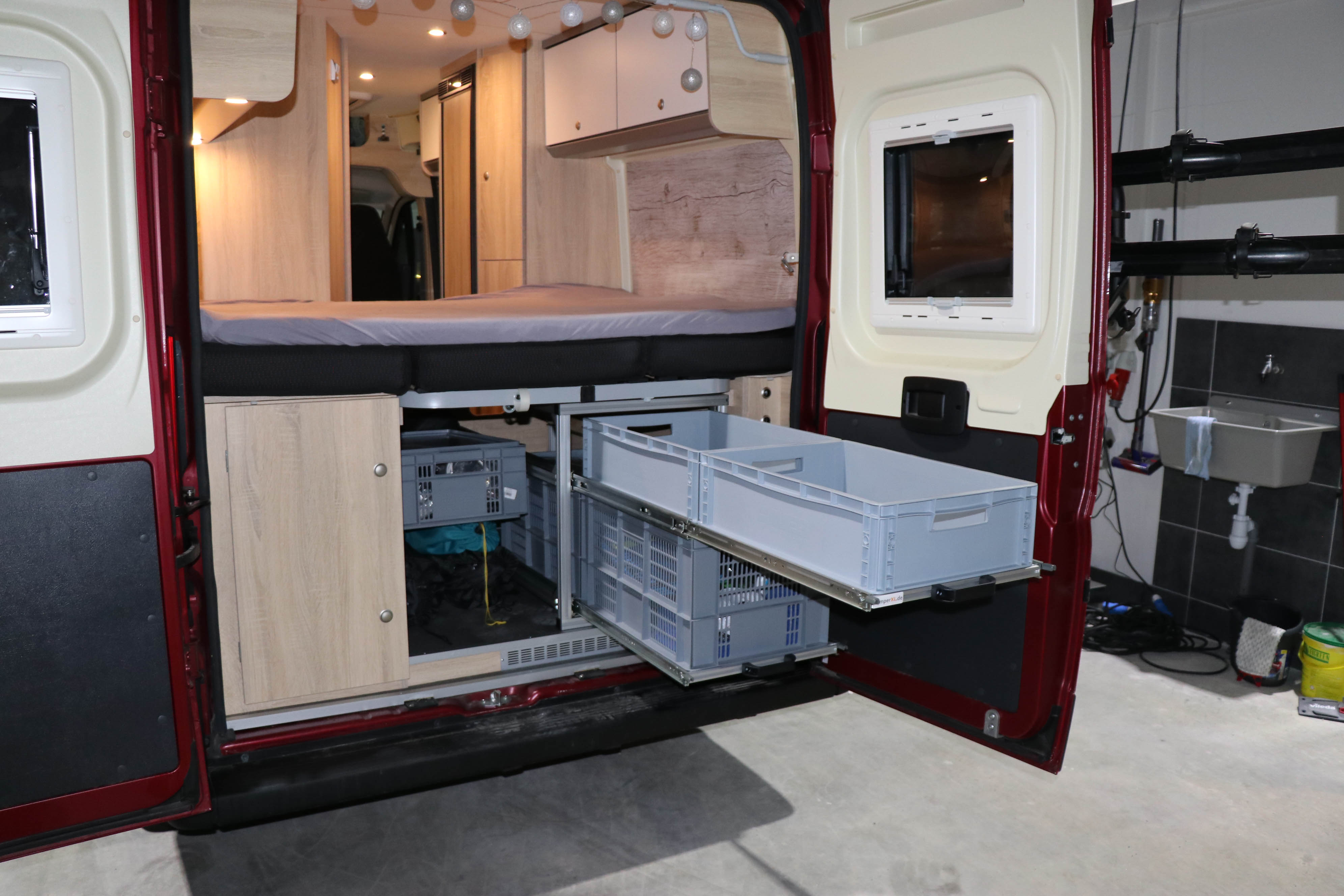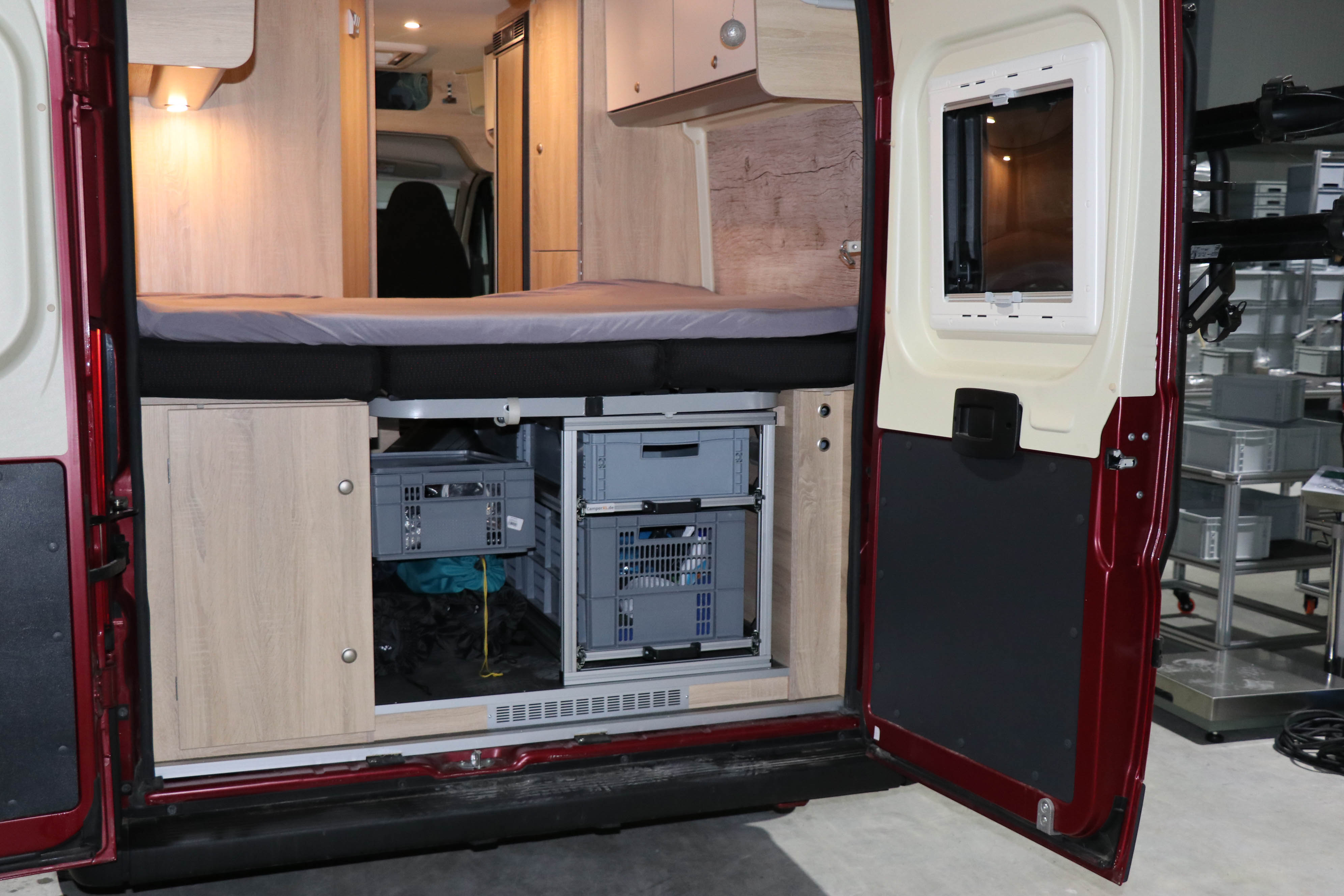 Rear pull-out with 2 levels for the Clever Celebration. We do not have a ready-made set for this vehicle. When ordering, please specify the desired or available height. On request, also with installation by our team. Then you don't need to measure anything. Just get in touch and arrange an appointment. We will discuss everything in our specialist workshop.